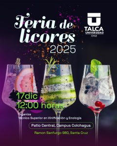 El próximo 17 de diciembre, desde las 12:00 horas, el Patio Central del Campus Colchagua en Santa Cruz será el escenario de la Feria de Licores 2025, organizada por la carrera Técnico Superior en Vinificación y Enología de la Universidad de Talca.